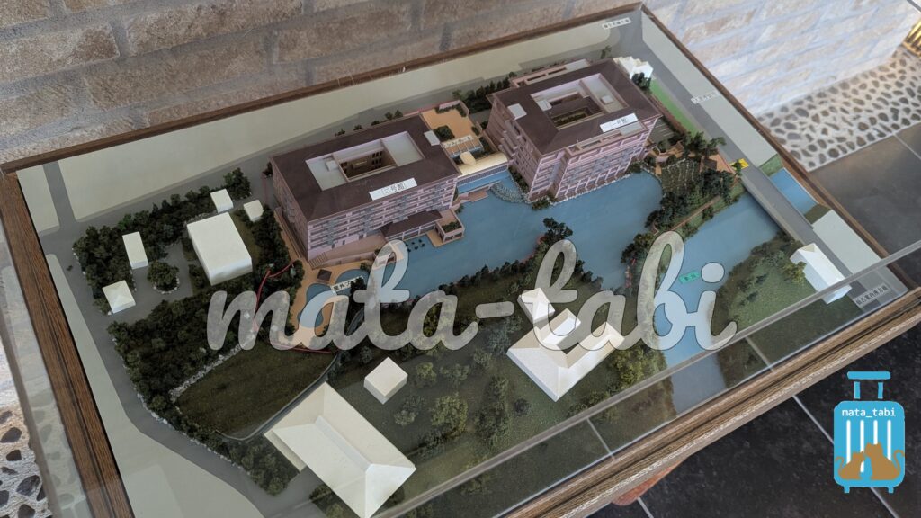 ホテルには一号館と二号館があります。今いる場所は真ん中にある渡り廊下です。