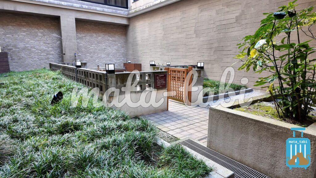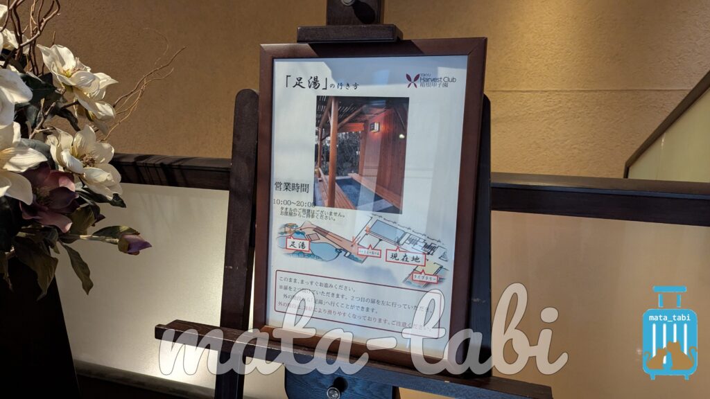 足湯や中庭への道は少し分かりづらいです。通路を進むと案内の看板がありました。