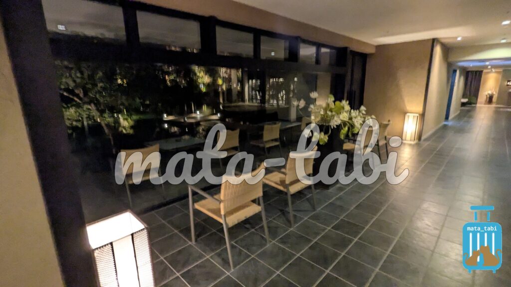 続いて中庭エリアの散歩に出かけましょう👞 2Fのレストランの先にある通路を進んで行きます。