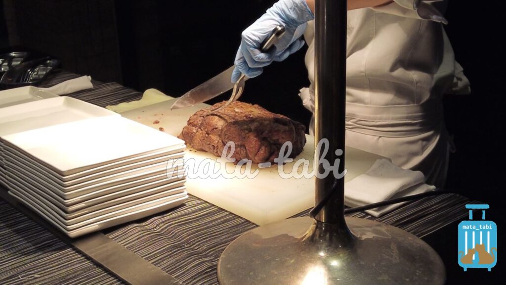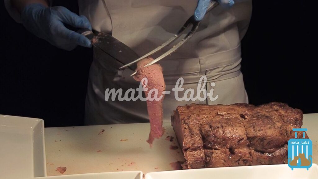 ひとつ目は、シェフが目の前で切り分けてくれるローストビーフです🐄