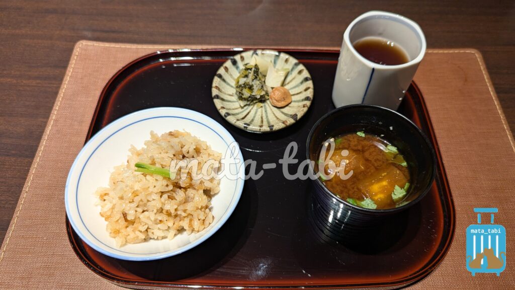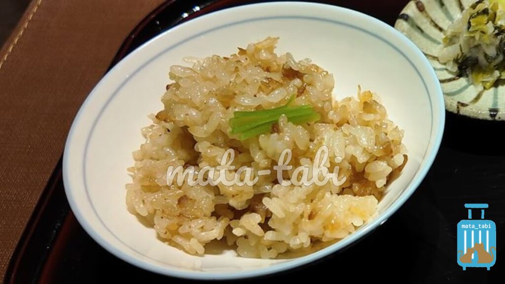 食事はイタヤ貝の炊き込みご飯。出汁の旨味を感じるご飯でした。