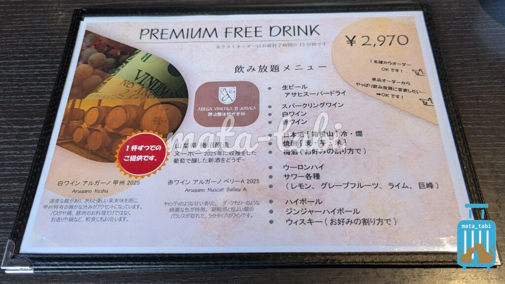 飲み放題も用意されています。(レストラン利用と同じく90分制)