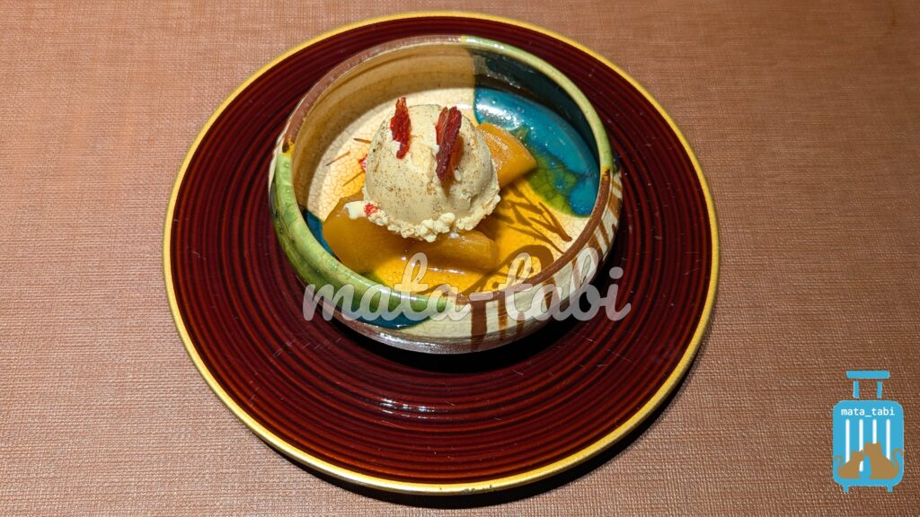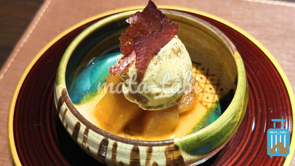 水菓子はリンゴのカラメルコンフォート、アールグレイ風味の豆乳のジェラート。