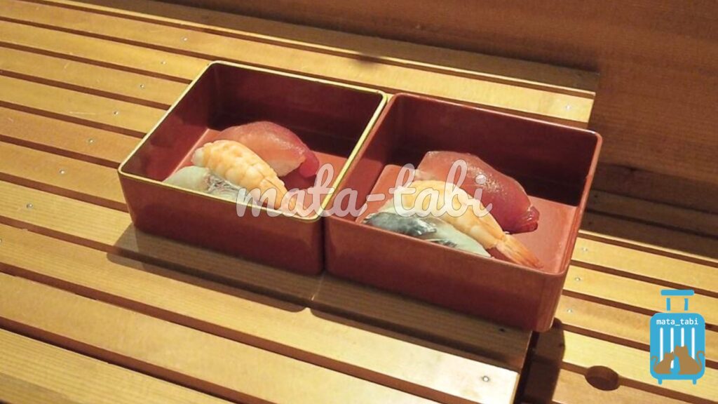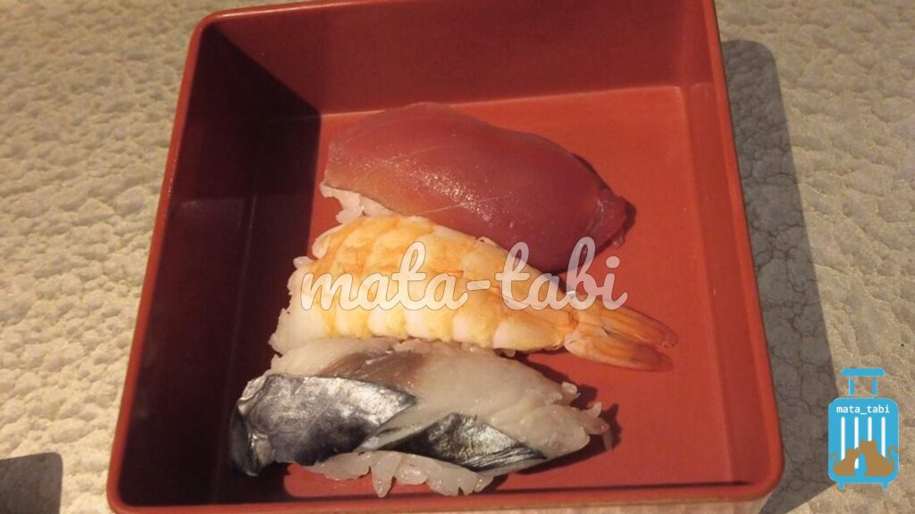 もう一点は、お鮨です。この日はしめ鯖、蒸しエビ、マグロでした🐟