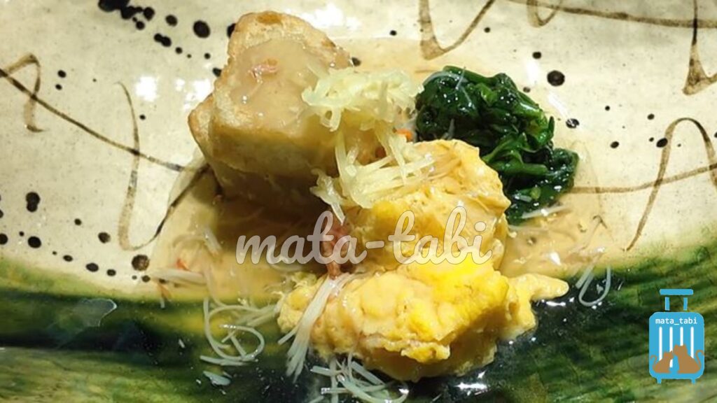 左上が海老芋です。そこにさらにエビ、カニのあんかけをあわせて、春菊やきざんだ生姜の風味で味わいます♪