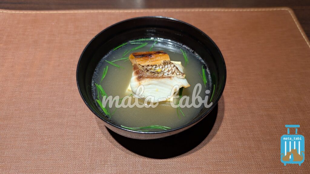 塩焼きにした大きなタイの塩汁仕立ては、焼き葱、卵豆腐や香り豊かな柚子、露生姜といただく絶品♪