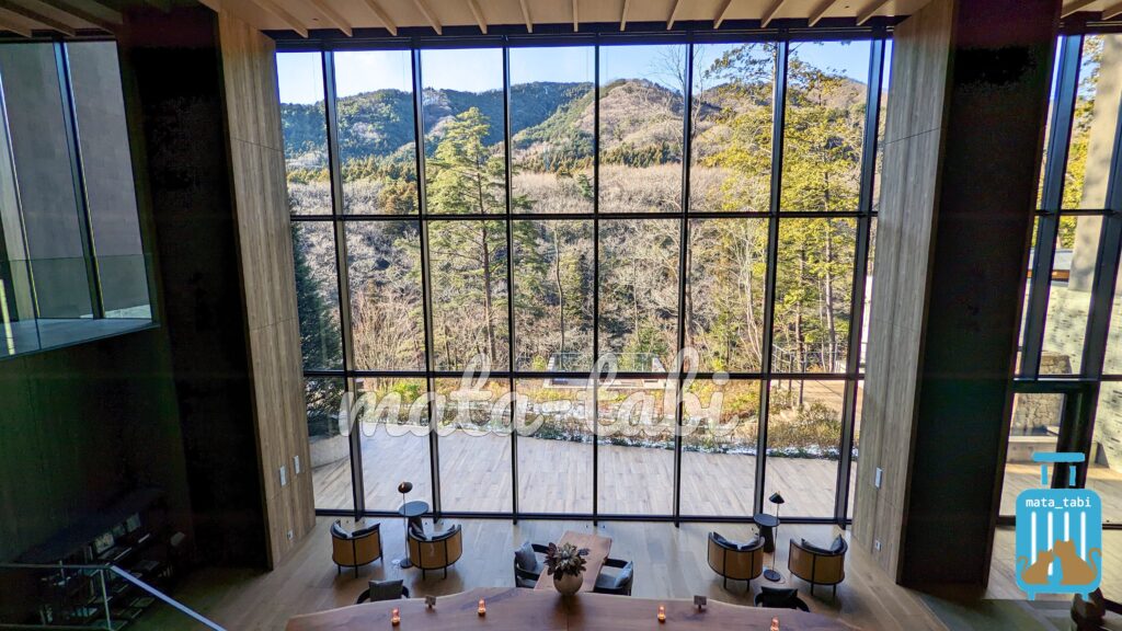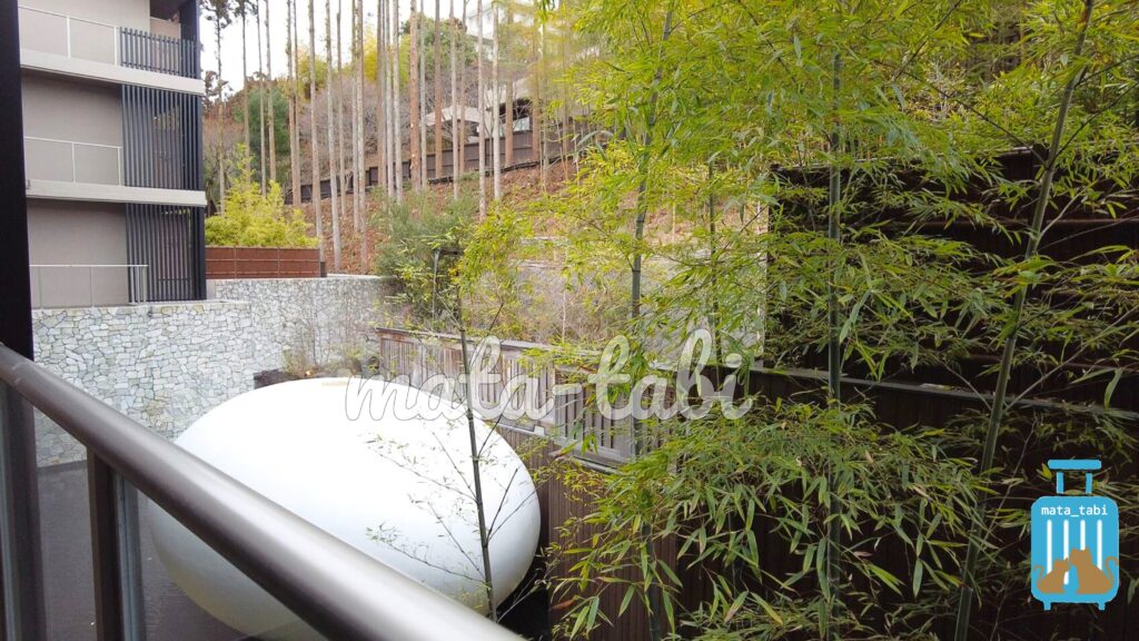 高くそびえる鷹峯、スロープカーでの移動、瞑想風呂など非日常的な空間に滞在できるのが魅力。
