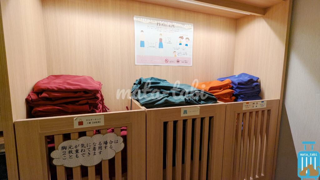 扉を開くと男女ともに専用着衣が用意されています。水着を持って来なくても利用できるのが嬉しいですね♪