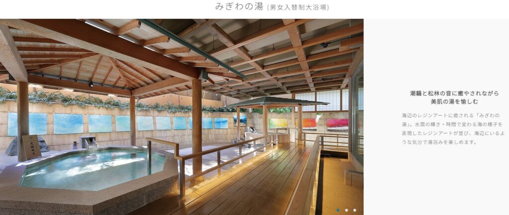 大浴場と同じく源泉は”潮騒の湯“です。自家源泉で塩分を含んだ泉質、効能は神経・筋肉・関節痛や冷え症など。