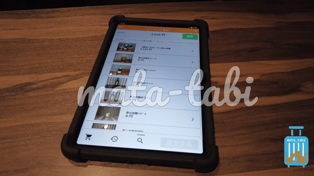 その他のソフトドリンクは有料になり、席にあるタブレットで注文します。