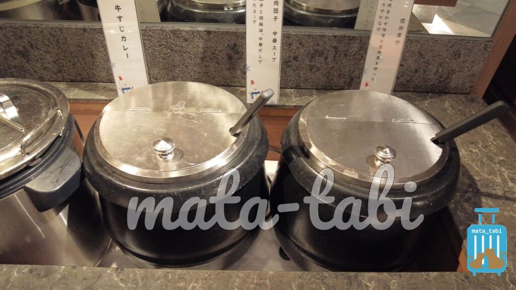 牛すじカレー、肉団子 中華スープ、信州茸汁