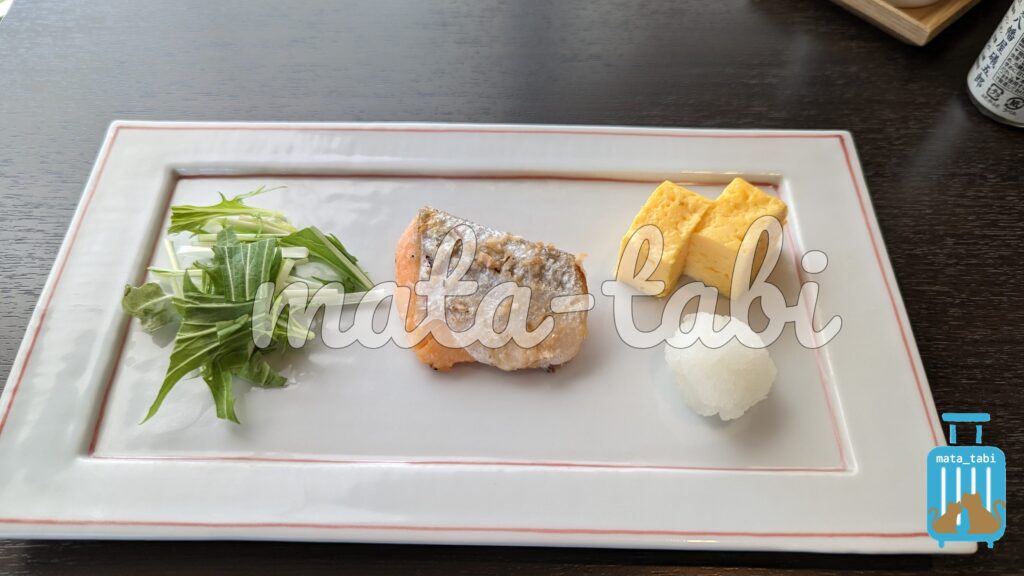 焼き魚やだし巻き卵も付いてきます。この日は鮭でした🐟