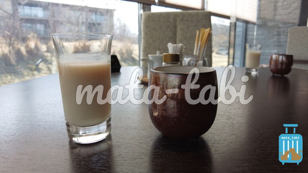 最初に提供されたのは、ほうじ茶と、リンゴと豆乳、ノンアルコールの甘酒のジュース