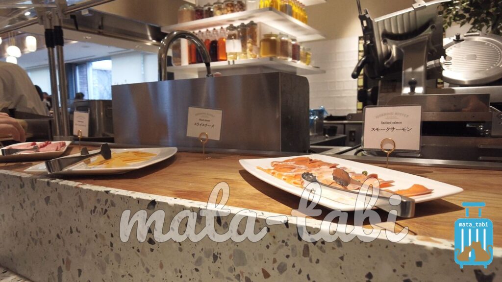 カウンターにはスモークサーモン、スライスチーズ、サラミソーセージ🐷