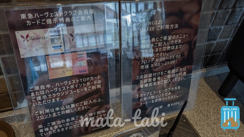 売店で1杯200円でコップと珈琲ポッドを買えます。なお東急ハーヴェストクラブ会員の方はカード提示で1杯無料になるようでした。