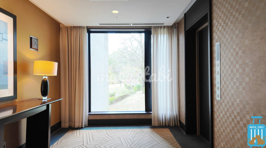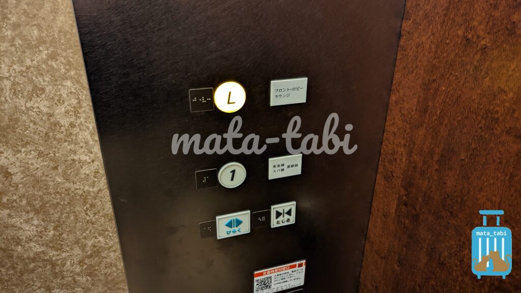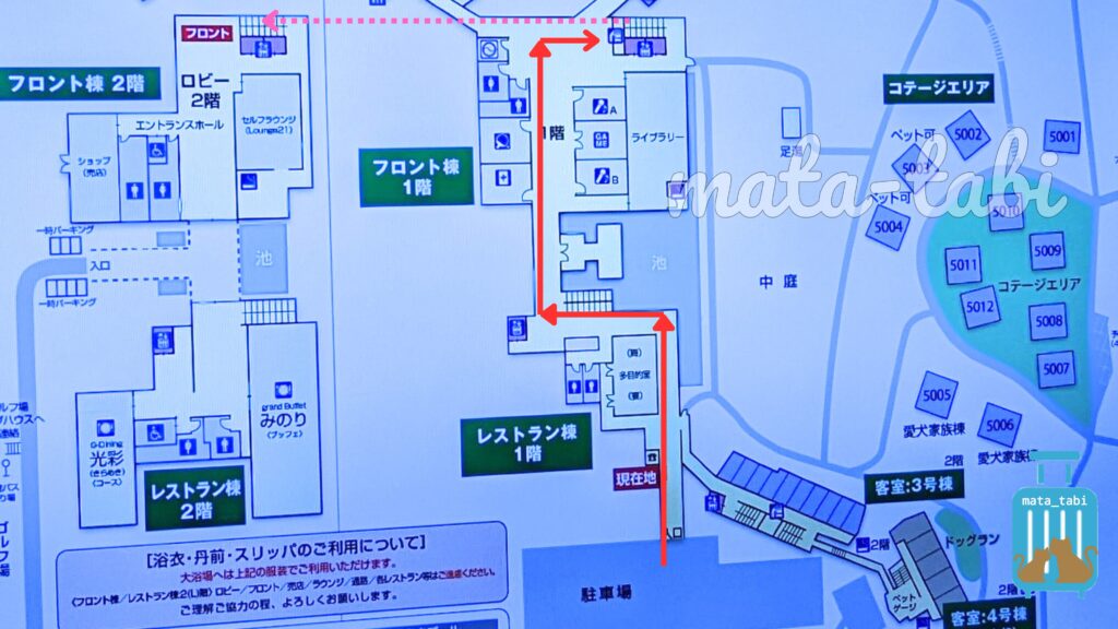 フロントロビーまでは少し遠く、1Fで池やライブラリーを横目に通り抜けてから、エレベーターまたは階段でフロント階(LF)にあがっていきます。