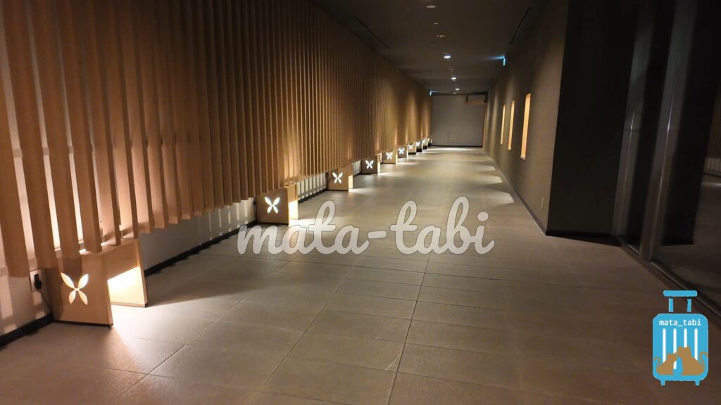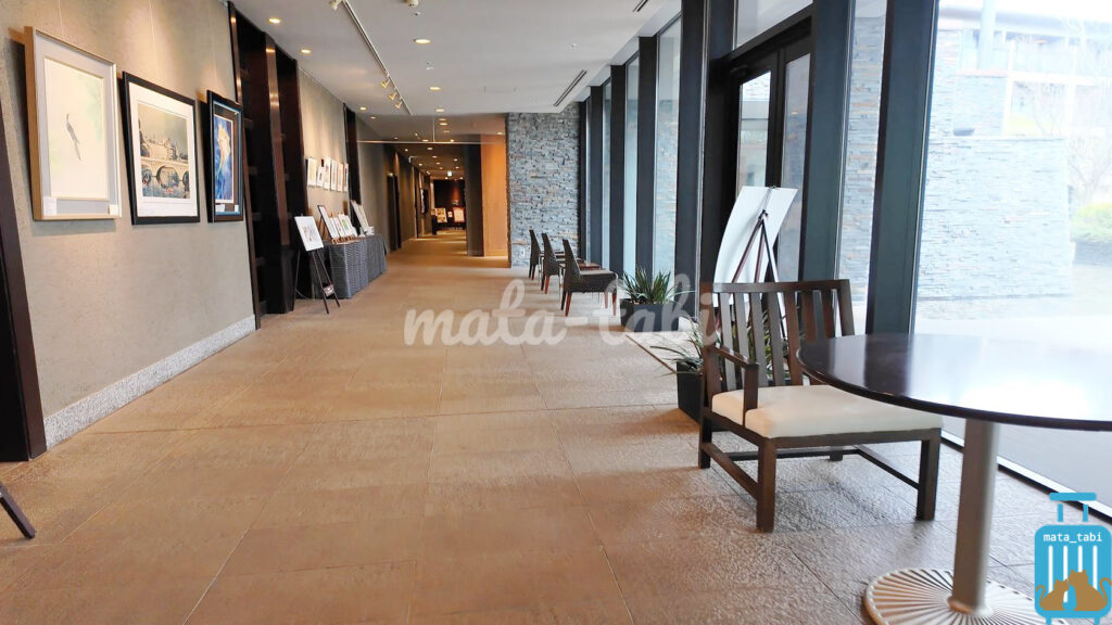 フロントロビーからフロアを1つ降りると、中庭を挟んだレストラン棟との連絡通路。