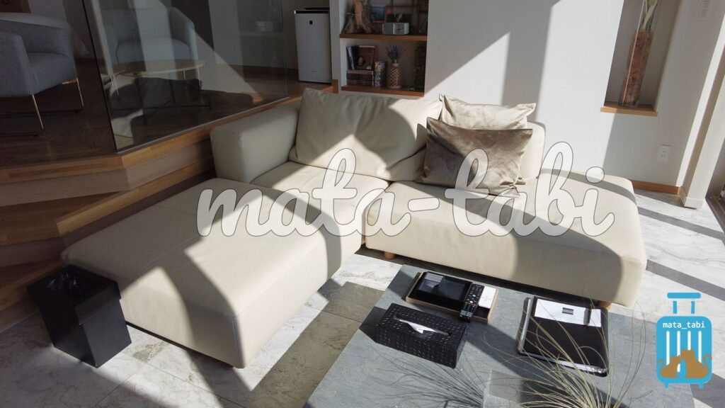 階段を下りてリビングエリアを見てみましょう。大きくてラグジュアリーなソファは柔らかく、腰を沈めるとそのまま昼寝してしまいそうな心地よさ🍵