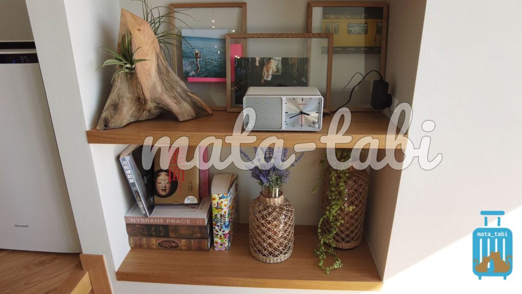 壁際にある装飾品や本など、素敵なインテリアが目を引きます👀