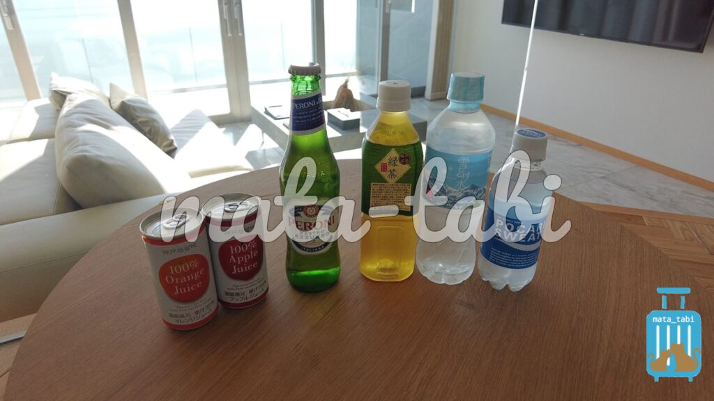 オレンジ、リンゴのジュースとお茶、ミネラルウォーター、ポカリスエットとPERONIというイタリアのビールがそれぞれ2本ずつありました。