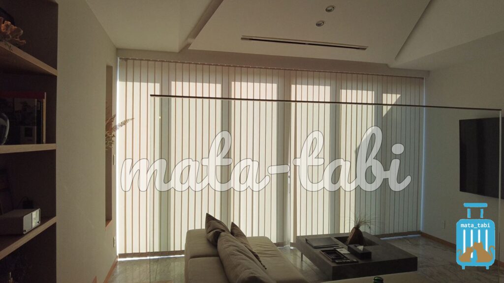 続いてお部屋の眺望です。窓のカーテンはリモコンで開け閉め可能です。
