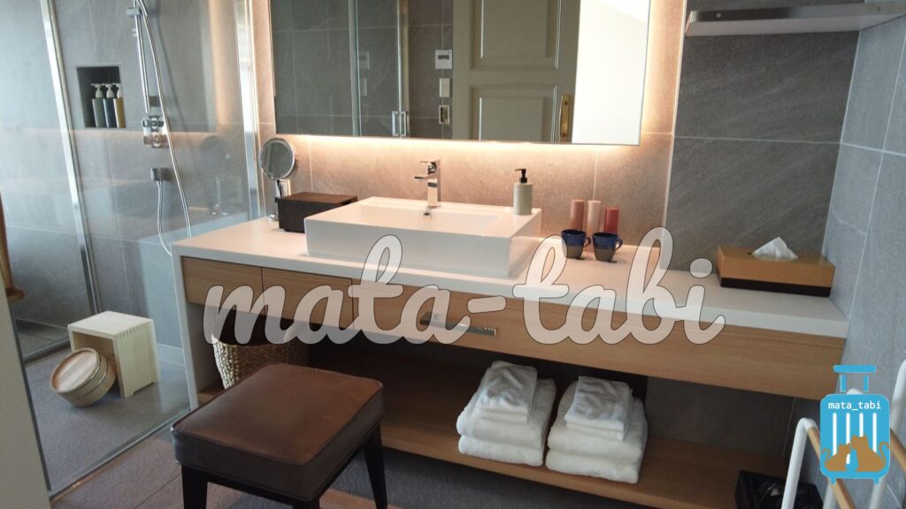 洗面エリアに戻ります。シンクは一つです。イスがあって嬉しい✨