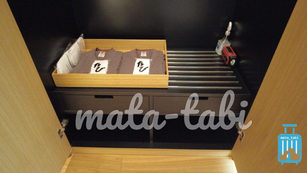 ベッド横にあるクローゼットには、ハンガーや除菌スプレー、手回し充電のラジオ付きライト。作務衣、足袋、スリッパなどがあります。