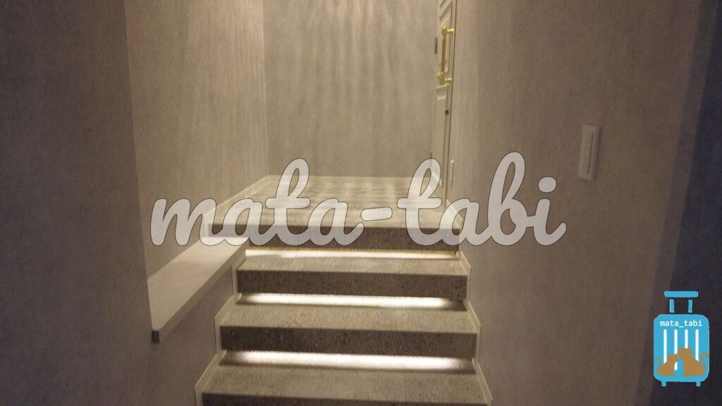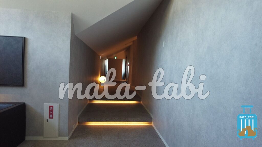 3Fに上がると、落ち着いた雰囲気の廊下に出ました。貸切露天風呂もあるフロアです。こちらも少し階段があります。