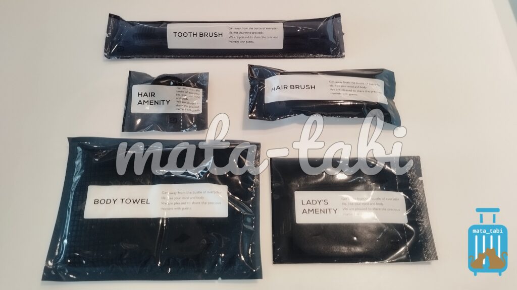 女性用は歯ブラシ、ヘアゴム、ヘアブラシ、ボディタオル、コットンなど