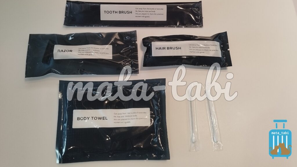 男性用は歯ブラシ、髭剃り、ヘアブラシ、ボディタオル、綿棒など。