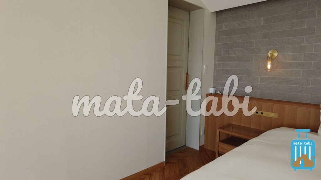 お待たせしました、客室露天風呂の紹介です。ベッド横に、洗面エリアに続く扉があります。